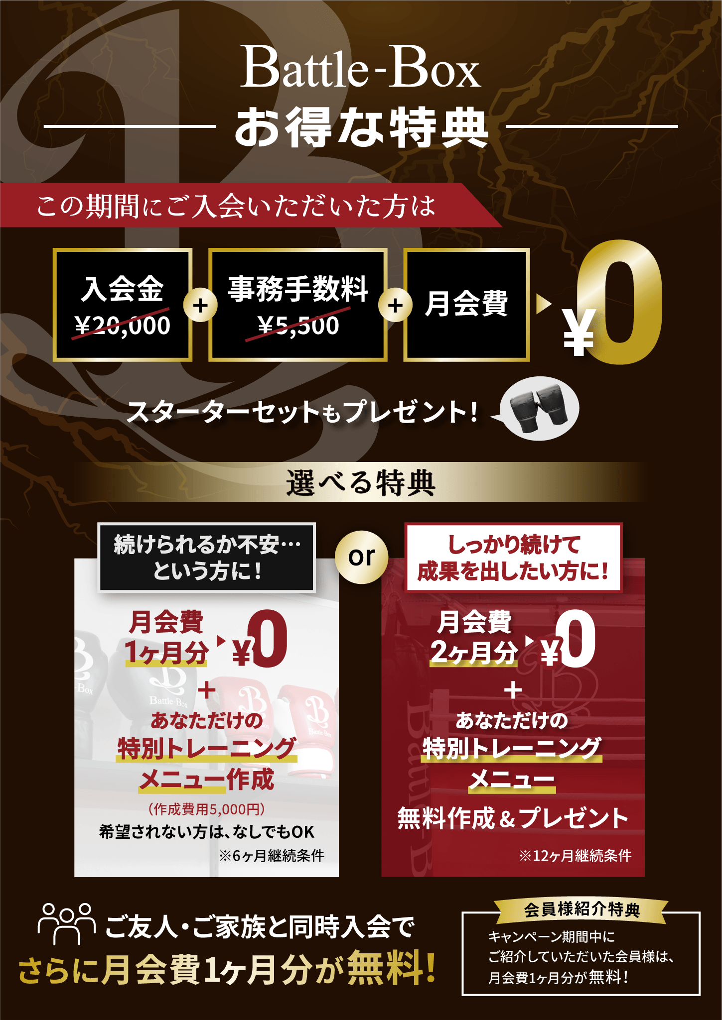 体験から入会希望の方は特典を選択する事が出来ます! 【特典A】 ・入会金 ¥0(通常¥20,000) ・事務手数料 ¥0(通常¥5,500) ・月会費 1ヶ月分 ¥0 ・スターターキット無料プレゼント ・特別トレーニングメニュー作成(作成費5,000円) ※6ヶ月継続条件 【特典B】 ・入会金 ¥0(通常¥20,000) ・事務手数料 ¥0(通常¥5,500) ・月会費 2ヶ月分 ¥0 ・スターターキット無料プレゼント ・特別トレーニングメニュー作成 ※12ヶ月継続条件 |